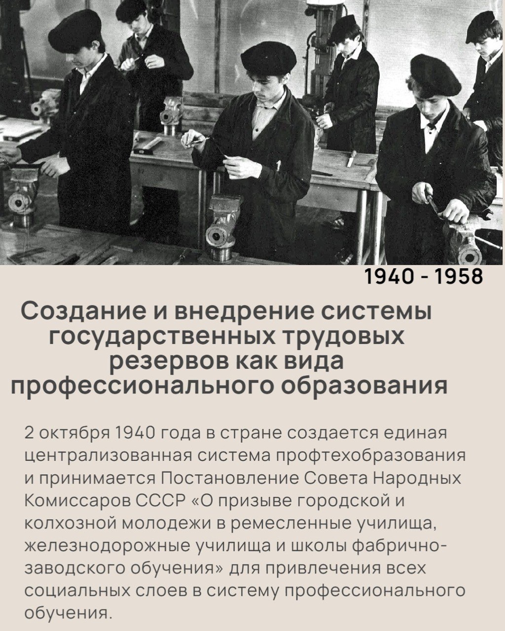 Начало истории СПО официально закреплено Указом Президиума Верховного Совета СССР от 2 октября 1940 года «О государственных трудовых резервах». Этот документ ознаменовал завершение этапа поисков эффективных форм подготовки рабочих кадров и стал фундаментом для создания стройной, централизованной системы обучения.