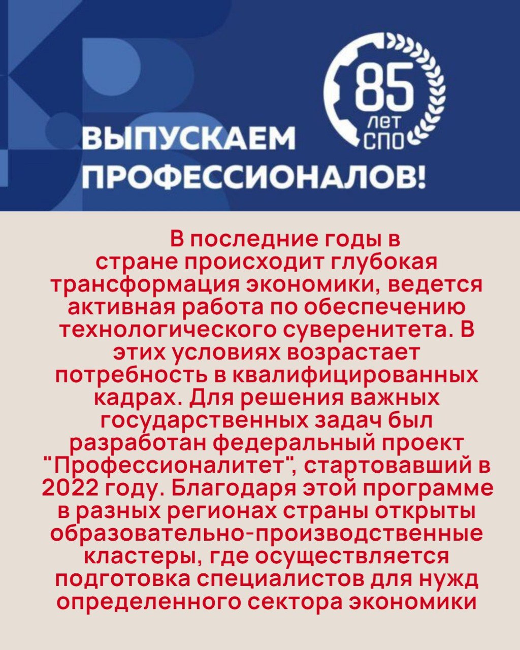 В честь 85-летнего юбилея СПО Министерство просвещения РФ утвердило план мероприятий, которые пройдут по всей стране. В их числе – конференции, выставки, тематические фестивали и другие события, направленные на повышение престижа рабочих профессий и популяризацию среднего профессионального образования среди молодежи.