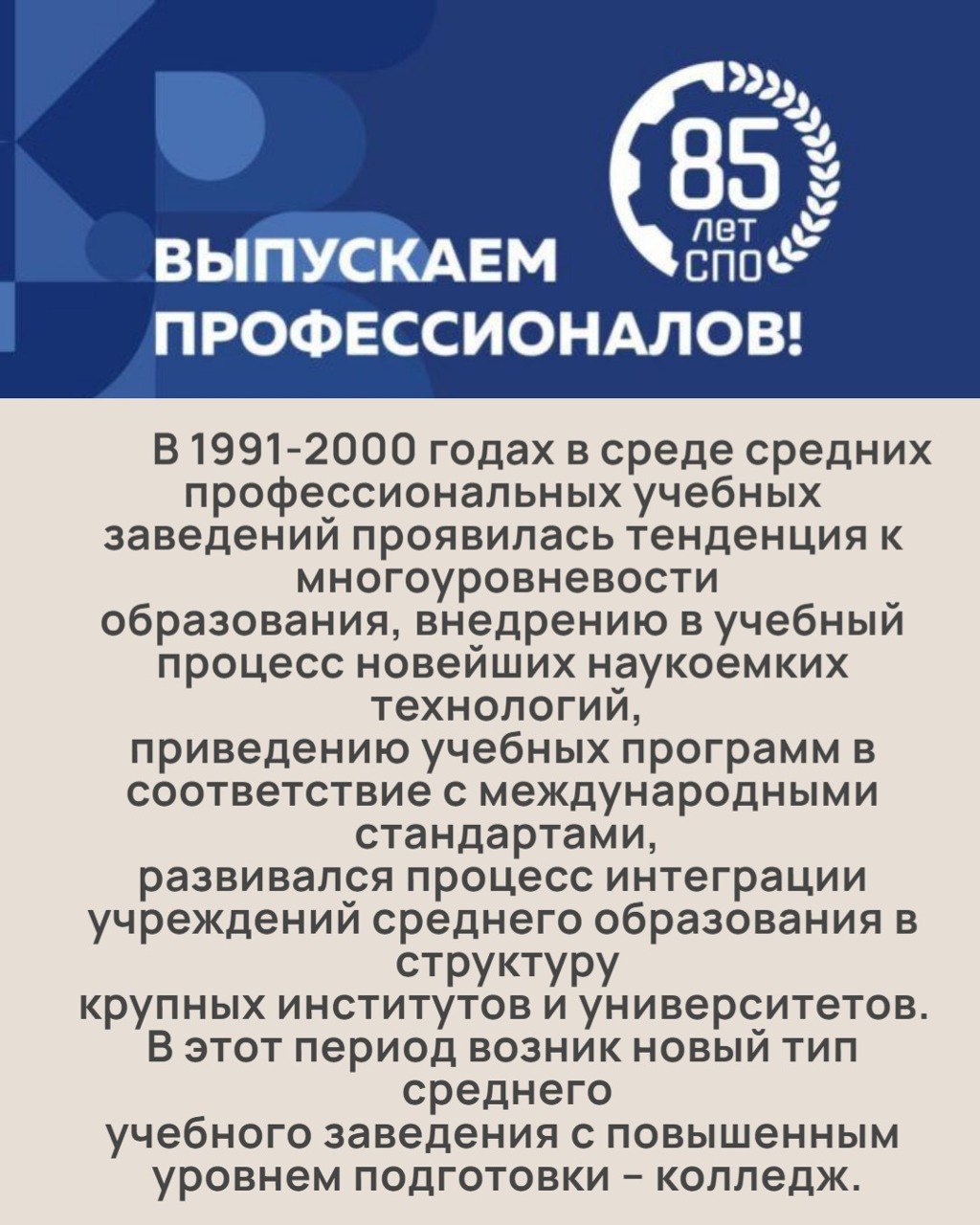 2 октября 2025 года исполняется 85 лет со дня основания системы среднего профессионального образования (СПО) в России. Это значимое событие для миллионов граждан страны – студентов колледжей и техникумов, их преподавателей и наставников, выпускников, занятых в промышленности и социальной сфере. СПО объединяет поколения и служит опорой для устойчивого развития государства.